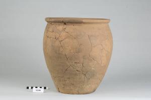 Urna ovoide con orlo piatto, breve collo e fondo piano.