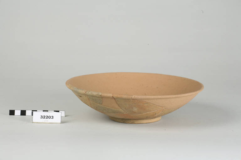 Patera in terra sigillata con orlo ingrossato, parete arrotondata e piede ad anello.