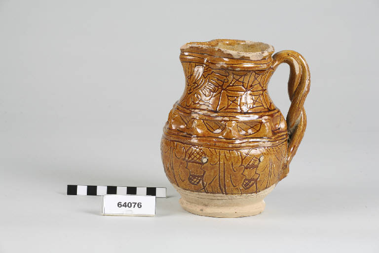 Boccale in ceramica graffita monocroma marrone con ornato vegetale e figurato.
