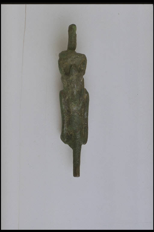 - NOTIZIE STORICO CRITICHE L'opera fa parte della raccolta egizia Giuseppe Acerbi (Castelgoffredo 1773 - 1846), costituita da reperti archeologici selezionati dall'erudito e scienziato naturalista mantovano - nominato nel 1826 Console Generale d'Austria in Egitto - tra Alessandria e Assuan, nella seconda metà degli anni Venti del XIX secolo. Entrata a far parte ufficialmente delle collezioni comunali di Mantova con il lascito di Agostino Zanelli, nipote ed unico erede dell'Acerbi, nel 1876, la raccolta ha conosciuto differenti collocazioni nel corso del tempo, fino all'attuale.\nL'esemplare é compreso nel gruppo di statuette votive - prevalentemente in bronzo - tipiche del periodo compreso tra la XXVI dinastia e l'età tolemaico-romana e rappresentanti l'intero pantheon egizio. Figura maschile stante; il caratteristico copricapo che permette l'identificazione con la divinità è sommariamente reso.