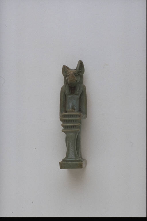 - NOTIZIE STORICO CRITICHE L'opera fa parte della raccolta egizia Giuseppe Acerbi (Castelgoffredo 1773 - 1846), costituita da reperti archeologici selezionati dall'erudito e scienziato naturalista mantovano - nominato nel 1826 Console Generale d'Austria in Egitto - tra Alessandria e Assuan, nella seconda metà degli anni Venti del XIX secolo. Entrata a far parte ufficialmente delle collezioni comunali di Mantova con il lascito di Agostino Zanelli, nipote ed unico erede dell'Acerbi, nel 1876, la raccolta ha conosciuto differenti collocazioni nel corso del tempo, fino all'attuale.\nL'amuleto rientra in un cospicuo gruppo di oggetti analoghi per tipologia e funzione (apotropaica/magica) e, tra questi, nella serie di amuleti raffiguranti divinità. La statuetta rappresenta il dio Anubi, protettore dei morti e dei cimiteri, dal corpo umano e testa di cane. Il dio regge un pilastro "ded" accuratamente descritto (simbolo, in origine, di uno dei quattro pilastri che sorreggono il cielo, quindi attributo di Osiride).