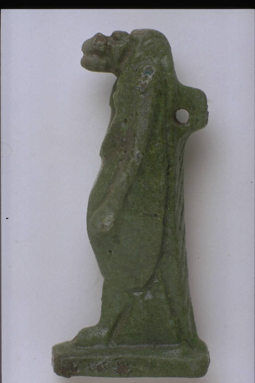 - NOTIZIE STORICO CRITICHE L'opera fa parte della raccolta egizia Giuseppe Acerbi (Castelgoffredo 1773 - 1846), costituita da reperti archeologici selezionati dall'erudito e scienziato naturalista mantovano - nominato nel 1826 Console Generale d'Austria in Egitto - tra Alessandria e Assuan, nella seconda metà degli anni Venti del XIX secolo. Entrata a far parte ufficialmente delle collezioni comunali di Mantova con il lascito di Agostino Zanelli, nipote ed unico erede dell'Acerbi, nel 1876, la raccolta ha conosciuto differenti collocazioni nel corso del tempo, fino all'attuale.\nL'amuleto rientra in un cospicuo gruppo di oggetti analoghi per tipologia e funzione (apotropaica/magica) e, tra questi, nella serie di amuleti raffiguranti divinità. La statuetta rappresenta Tueris, dea sotto forma di ippopotamo ritto sulle zampe posteriori, con braccia e mammelle femminili, protettrice delle puerpere. Il corpo é privo di modellato; la coda dell'animale é decorata da un motivo a spina di pesce. Pilastro dorsale e base.