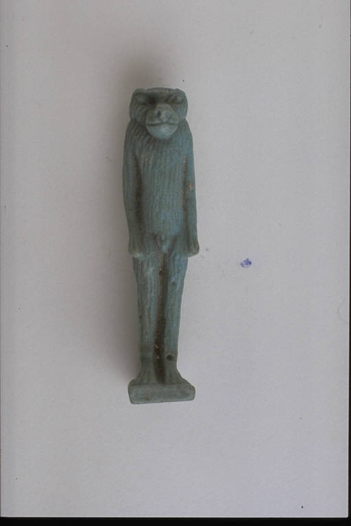 - NOTIZIE STORICO CRITICHE L'opera fa parte della raccolta egizia Giuseppe Acerbi (Castelgoffredo 1773 - 1846), costituita da reperti archeologici selezionati dall'erudito e scienziato naturalista mantovano - nominato nel 1826 Console Generale d'Austria in Egitto - tra Alessandria e Assuan, nella seconda metà degli anni Venti del XIX secolo. Entrata a far parte ufficialmente delle collezioni comunali di Mantova con il lascito di Agostino Zanelli, nipote ed unico erede dell'Acerbi, nel 1876, la raccolta ha conosciuto differenti collocazioni nel corso del tempo, fino all'attuale.\nL'amuleto rientra in un cospicuo gruppo di oggetti analoghi per tipologia e funzione (apotropaica/magica) e, tra questi, nella serie di 22 amuleti raffiguranti animali, la cui venerazione interessa l'Egitto dal periodo storico fino all'Età Romana. Il babbuino, sacro al dio Thot, é rappresentato in piedi, il pelame definito da incisioni rapide e irregolari; il dorso, pure lavorato, fa corpo con il sedile a cui si sovrappone la coda.