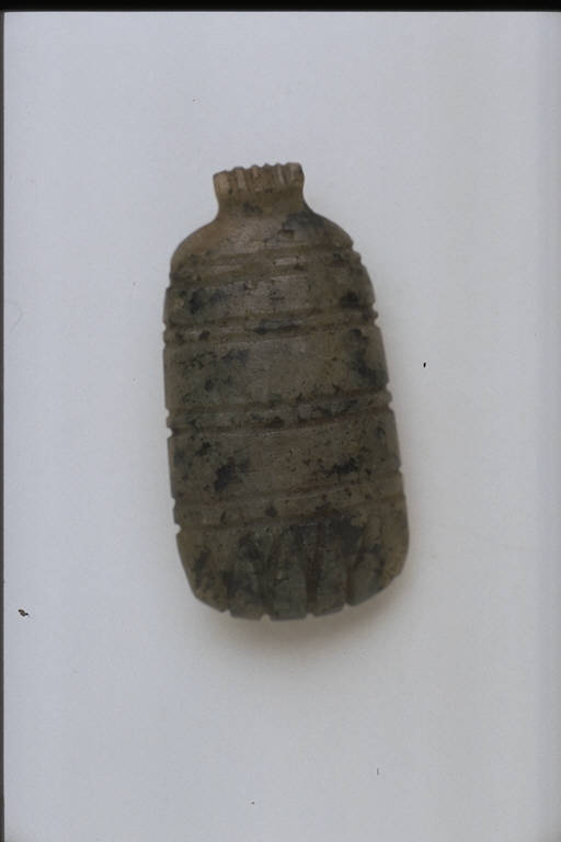 - NOTIZIE STORICO CRITICHE L'opera fa parte della raccolta egizia Giuseppe Acerbi (Castelgoffredo 1773 - 1846), costituita da reperti archeologici selezionati dall'erudito e scienziato naturalista mantovano - nominato nel 1826 Console Generale d'Austria in Egitto - tra Alessandria e Assuan, nella seconda metà degli anni Venti del XIX secolo. Entrata a far parte ufficialmente delle collezioni comunali di Mantova con il lascito di Agostino Zanelli, nipote ed unico erede dell'Acerbi, nel 1876, la raccolta ha conosciuto differenti collocazioni nel corso del tempo, fino all'attuale.\nL'amuleto rientra in un cospicuo gruppo di oggetti analoghi per tipologia e funzione (apotropaica/magica) e, tra questi, nella serie di 36 amuleti raffiguranti simboli. L'oggetto rappresenta forse un panno aperto e frangiato, dal significato incerto. La forma dell'amuleto é vagamente elissoidale: una faccia, lievemente convessa, é decorata da regolari incisioni orizzontali e a trattini verticali in basso; l'altra é piatta e levigata.