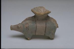 - NOTIZIE STORICO CRITICHE L'opera fa parte della raccolta egizia Giuseppe Acerbi (Castelgoffredo 1773 - 1846), costituita da reperti archeologici selezionati dall'erudito e scienziato naturalista mantovano - nominato nel 1826 Console Generale d'Austria in Egitto - tra Alessandria e Assuan, nella seconda metà degli anni Venti del XIX secolo. Entrata a far parte ufficialmente delle collezioni comunali di Mantova con il lascito di Agostino Zanelli, nipote ed unico erede dell'Acerbi, nel 1876, la raccolta ha conosciuto differenti collocazioni nel corso del tempo, fino all'attuale.\nLa piccola scultura in terracotta colorata di azzurro e nero rientra in un gruppo di opere e oggetti di età ellenistica: rappresenta un cinghiale, reggente sul dorso un elemento circolare svasato frammentario, forse il fondo di una piccola coppa. Gli occhi dell'animale sono resi in leggero rilievo e sottolineati dal colore; altrettanto definiti dal tratto colorato i dettagli anatomici delle orecchie e del pelame sulla schiena.
