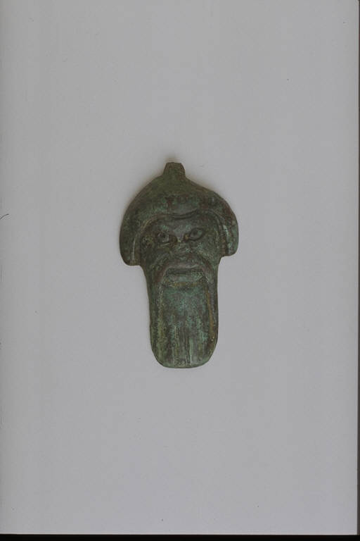 - NOTIZIE STORICO CRITICHE L'opera fa parte della raccolta egizia Giuseppe Acerbi (Castelgoffredo 1773 - 1846), costituita da reperti archeologici selezionati dall'erudito e scienziato naturalista mantovano - nominato nel 1826 Console Generale d'Austria in Egitto - tra Alessandria e Assuan, nella seconda metà degli anni Venti del XIX secolo. Entrata a far parte ufficialmente delle collezioni comunali di Mantova con il lascito di Agostino Zanelli, nipote ed unico erede dell'Acerbi, nel 1876, la raccolta ha conosciuto differenti collocazioni nel corso del tempo, fino all'attuale.\nLa piccola scultura in bronzo rientra in un gruppo di opere e oggetti di età ellenistica: si tratta di un pendente di collana rappresentante una maschera comica o satirica dai lunghi baffi spioventi, barba dritta e lunga, corta parrucca a casco. L'espressione grottesca é resa da dettagli marcatamente incisi, propri della coroplastica alessandrina.