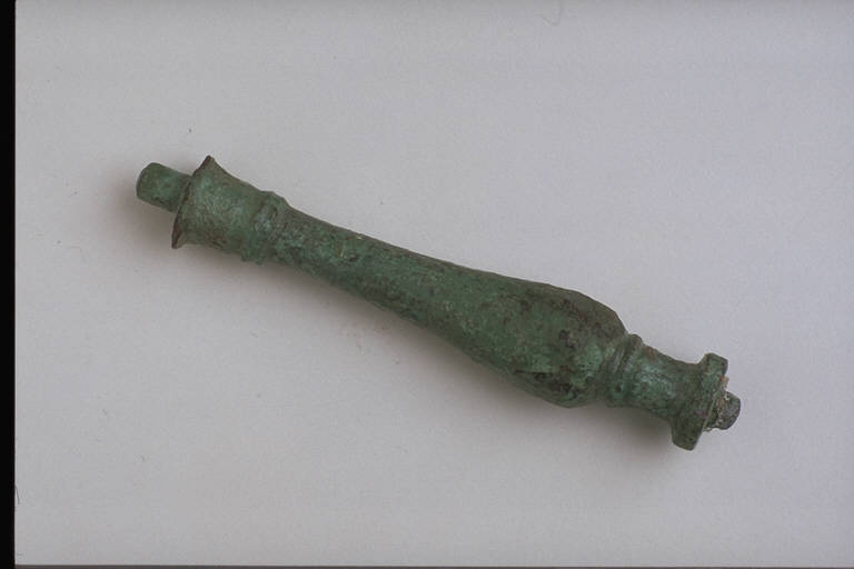 - NOTIZIE STORICO CRITICHE L'opera fa parte della raccolta egizia Giuseppe Acerbi (Castelgoffredo 1773 - 1846), costituita da reperti archeologici selezionati dall'erudito e scienziato naturalista mantovano - nominato nel 1826 Console Generale d'Austria in Egitto - tra Alessandria e Assuan, nella seconda metà degli anni Venti del XIX secolo. Entrata a far parte ufficialmente delle collezioni comunali di Mantova con il lascito di Agostino Zanelli, nipote ed unico erede dell'Acerbi, nel 1876, la raccolta ha conosciuto differenti collocazioni nel corso del tempo, fino all'attuale.\nL'oggetto rientra in un gruppo di alcuni elementi decorativi in bronzo per lo più destinati al complemento di arredi: si tratta, infatti, di un elemento tornito nella forma di una colonnetta papiriforme egizia, con base a rocchetto tipicamente greca; in alto e in basso reca un piolo di inserimento. Il pezzo é collocabile in età ellenistica.