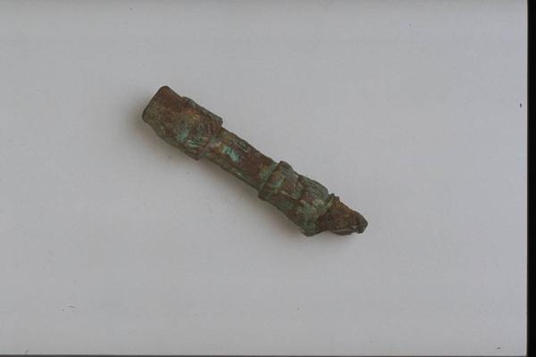 - NOTIZIE STORICO CRITICHE L'opera fa parte della raccolta egizia Giuseppe Acerbi (Castelgoffredo 1773 - 1846), costituita da reperti archeologici selezionati dall'erudito e scienziato naturalista mantovano - nominato nel 1826 Console Generale d'Austria in Egitto - tra Alessandria e Assuan, nella seconda metà degli anni Venti del XIX secolo. Entrata a far parte ufficialmente delle collezioni comunali di Mantova con il lascito di Agostino Zanelli, nipote ed unico erede dell'Acerbi, nel 1876, la raccolta ha conosciuto differenti collocazioni nel corso del tempo, fino all'attuale.\nL'oggetto rientra in un gruppo di alcuni elementi decorativi in bronzo per lo più destinati al complemento di arredi: si tratterebbe, infatti, di un particolare decorativo, costituito da elementi vegetali intorno alla colonnina centrale e da base globulare con toro e gola. Il pezzo è collocabile in età ellenistica.