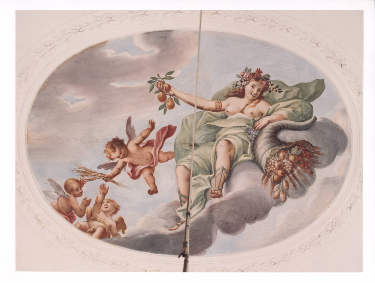- NOTIZIE STORICO CRITICHE Bianchi Salvatore fu pittore e quadraturista tra i meno noti del Seicento milanese, operoso soprattutto a Velate (Varese), suo paese natale. Entro un ovale profilato da una gradevole cornice in stucco a motivi floreali, è raffigurata Cerere assisa su una nube, con i conseuti attributi: le spighe di grano, con cui giocano anche i putti svolazzanti, la cornucopia traboccante di frutti, i fiori nei capelli. I colori chiari e brillanti, ariosi, rendono la composizione piacevole, anche se caratterizzata da uno stile pittorico modesto e corsivo.