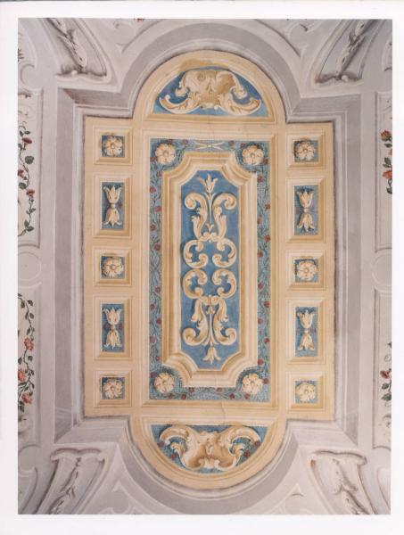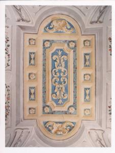 - NOTIZIE STORICO CRITICHE Questa piccola saletta nasce o come alcova o come sala da bagno alla "francese". L'aerea decorazione quadraturistica abbina una robustezza formale caratteristica del secolo precedente con una ricerca di leggiadria palese nella scelta dei colori chiari, come l'azzurro della parte centrale, o nei motivi pre-rococò visibili nelle conchiglie dischiuse nelle lunette. A sinistra appare una piccola finestra, aperta in epoca successiva, così come sono successivi il piccolo lavabo angolare e la porta a pannelli in legno e vetro, mentre all'Ottocento risale la copertura in piastrelle dell'originario pavimento in cotto.