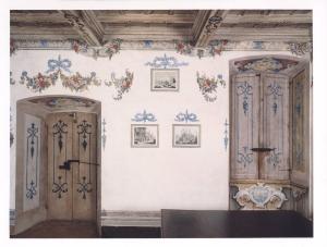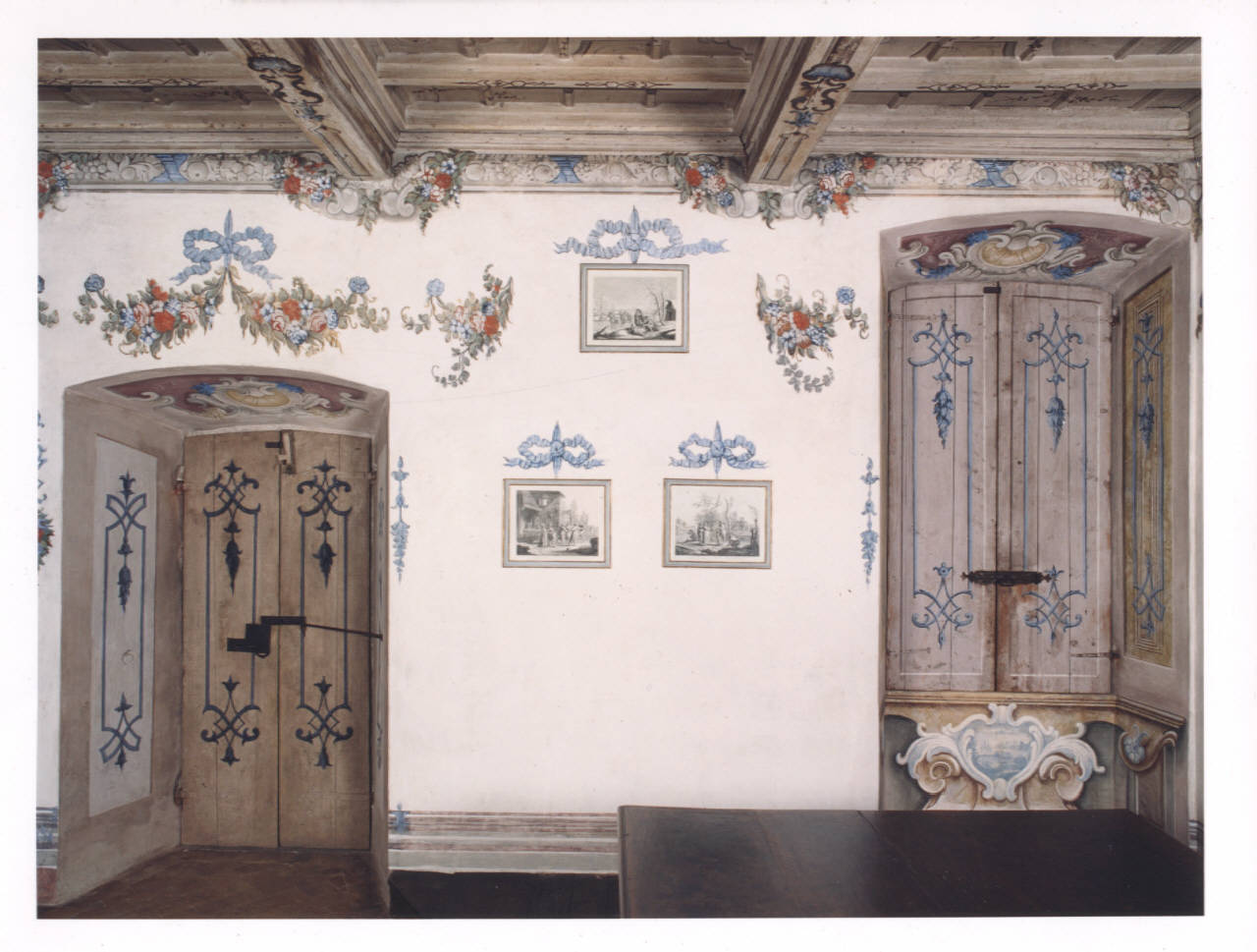 - NOTIZIE STORICO CRITICHE Le pareti dello studio presentano un motivo decorativo a grisaille con frutti e foglie e si notano, in corripondenza della parte finale delle travi lignee del soffitto, dei motivi decorativi a ricciolo con mazzi di fiori. Gli stessi si dispongono liberamente sulla restante superficie parietale, con una predominanza di rose, peonie e margherite azzurre, contrastanti col rosso degli altri fiori. Si segnala la presenza dei tre graziosi paesaggi in monocromo azzurro affrescati sotto le finestre.