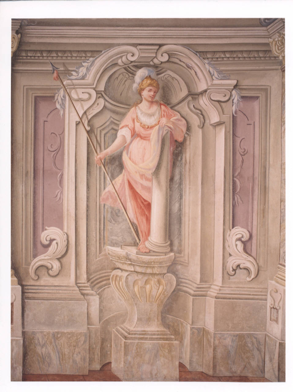 - NOTIZIE STORICO CRITICHE La galleria presenta una illusionistica struttura architettonica, dipinta, che inquadra sia le quattro porte sia le nicchie sostenute da sinuosi piedestalli in cui trovano posto le personificazioni delle Virtù. La decorazione è poi completata dalle volute sommitali con figure di genii e ninfe e con i decori geometrici negli sguanci delle finestre. Risulta la seconda figura femminile affrescata nella Galleria. Si noti una certa dolcezza dei contorni e la predilizione per colori chiari e sfumati, caratteristici anche per le sontuose quadrature tardobarocche, caratterizzate dagli innesti di serti floreali e di putti a monocromo giallo.