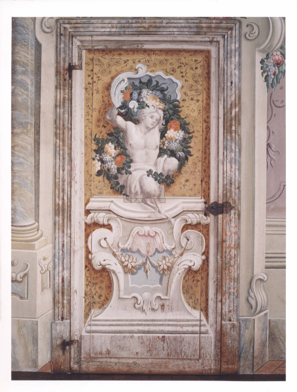 - NOTIZIE STORICO CRITICHE La galleria presenta una illusionistica struttura architettonica, dipinta, che inquadra sia le quattro porte sia le nicchie sostenute da sinuosi piedestalli in cui trovano posto le personificazioni delle Virtù. La decorazione è poi completata dalle volute sommitali con figure di genii e ninfe e con i decori geometrici negli sguanci delle finestre. Le pareti sono intervallata da quattro porte ad anta unica che si innestano perfettamente all'intera decorazione. Il satiro poggia su un alto basamento decorato con volute e un tralcio di fiori nella parte centrale, questo trattato quasi a monocromo. Lo sfondo, di intenso colore giallo, è animato da una sottile decorazione floreale.