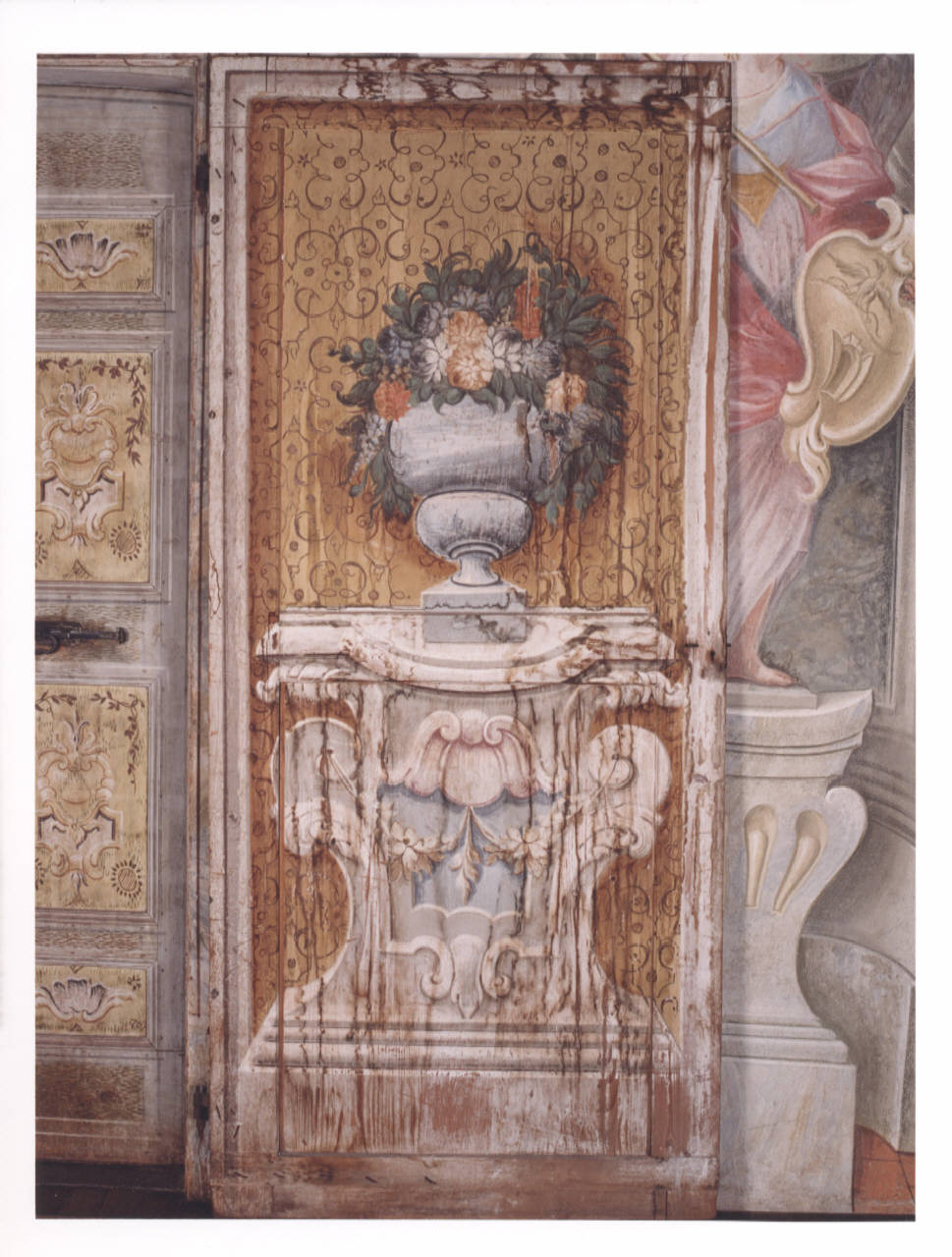 Porta in legno, ad anta unica, raffigura sul verso un basamento architettonico con volute accentuate e con l'uso di una tempera bianca e grigia che dona la sensazione di una architettura vera e propria, e con un piccolo serto monocromo di fiori. Sulla parte superiore vi è appoggiato un vaso di fiori. Il vaso ha una declicata decorazione in azzurro con paesaggio. Il fondo, di un giallo intenso, è animato da sottili cornici marroni.