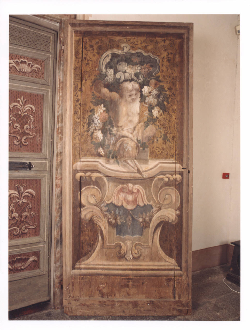 - NOTIZIE STORICO CRITICHE La galleria presenta una illusionistica struttura architettonica, dipinta, che inquadra sia le quattro porte sia le nicchie sostenute da sinuosi piedestalli in cui trovano posto le personificazioni delle Virtù. La decorazione è poi completata dalle volute sommitali con figure di genii e ninfe e con i decori geometrici negli sguanci delle finestre. Le pareti sono intervallata da quattro porte ad anta unica che si innestano perfettamente all'intera decorazione. Il giovane satiro che sorregge sopra il capo una conchiglia dalla quale parte un ricco serto di fiori policromi in cui spiccano rose, peonie e margherite. Poggia su un alto basamento decorato con volute e un tralcio di fiori nella parte centrale, questo trattato quasi a monocromo. Lo sfondo, di intenso colore giallo, è animato da una sottile decorazione floreale.