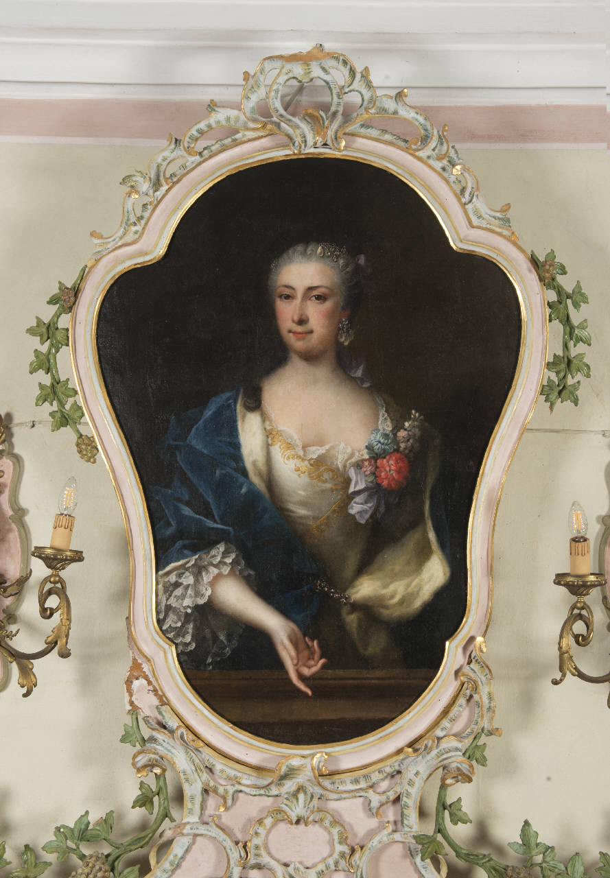 Il dipinto, inserito in una cornice lignea sagomata e dorata, è un ritrat\nto della contessa milanese Isabella Giulini. Opera di un anonimo artista lombardo, appartiene alla prima metà del XVIII secolo.