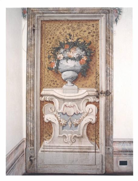 - NOTIZIE STORICO CRITICHE Splendida porta dipinta a tempera raffigurante un alto basamento marmoreo con volute a ricciolo, conchiglia centrale e un festone a monocromo con foglie. La struttura regge un vaso, dipinto a monocromo con un delicato paesaggio, arricchito da un varipinto mazzo di fiori. Tutta la decorazione si imposta su un fondo in ocra variato da sottili elementi floreali, reticoli, perline, quasi ad imitazione di un tessuto prezioso. La porta fu oggetto di furto nel corso di una delle varie incursioni alla Villa avvenute negli ultimi decenni del secolo scorso; venne poi ritrovata ancora accatastata sul camion in fuga.