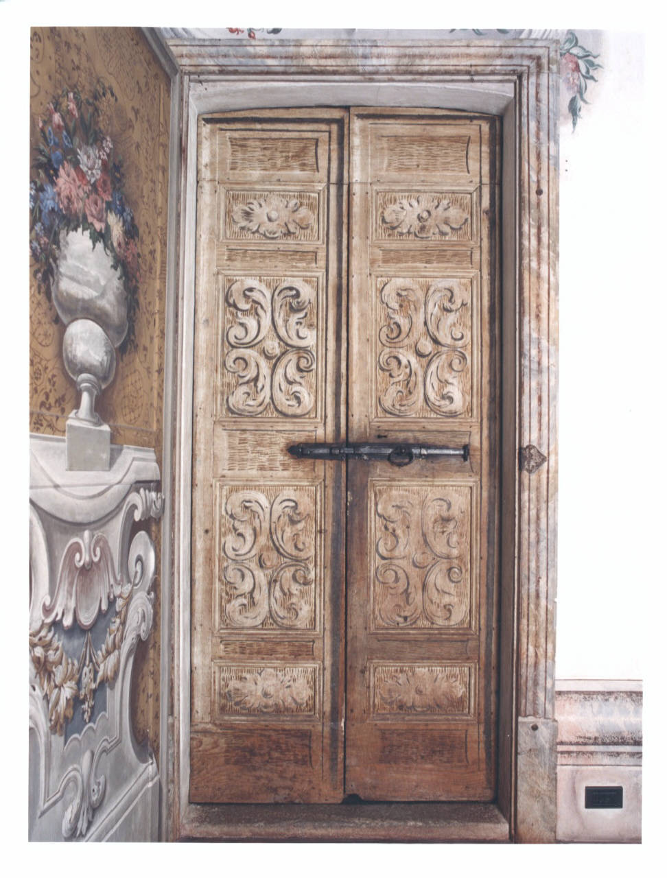 - NOTIZIE STORICO CRITICHE La porta ad anta unica racchiude una seconda porta a due battenti, sempre dipinta a tempera, che presenta la caratteristica suddivisione in riquadri decorati con motivi fogliacei a monocromo beige con rialzi in marrone e tocchi di bianco per dare maggiore luminosità. Il fondo è trattato con sottili trattini in verticale o orizzontale, su cui si imposta la decorazione.