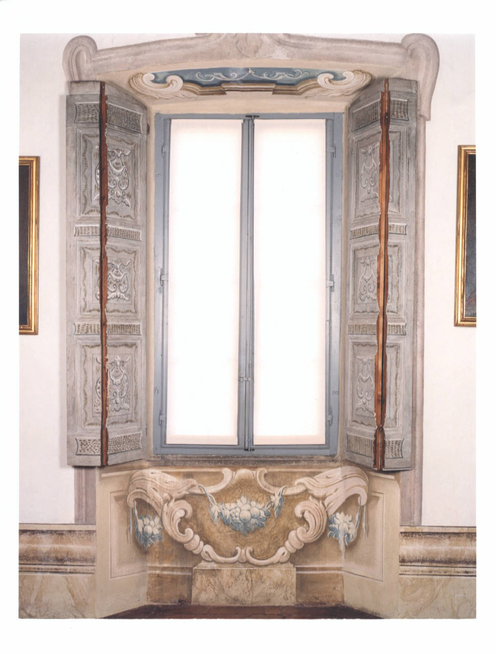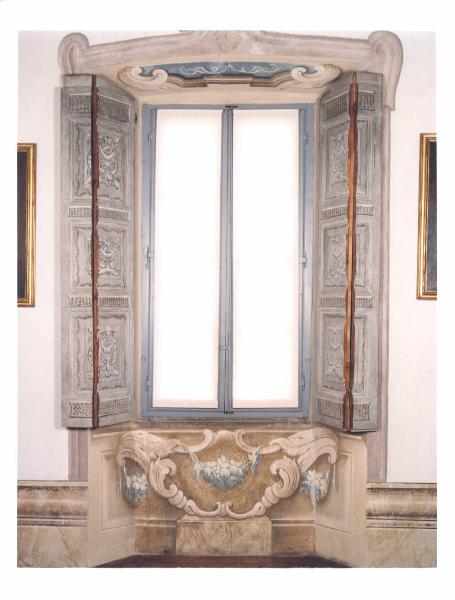 - NOTIZIE STORICO CRITICHE La finestra si caratteriza per una decorazione ad affresco caratterizzata da un motivo centrale a conchiglia arricchito da festoni con frutti e foglie. Nella parte superiore è stata creata una specchiatura dalla cornice curvilinea nella parte inferiore campita da un intenso colore azzurro e alleggerita da una sottile cornice bianca.