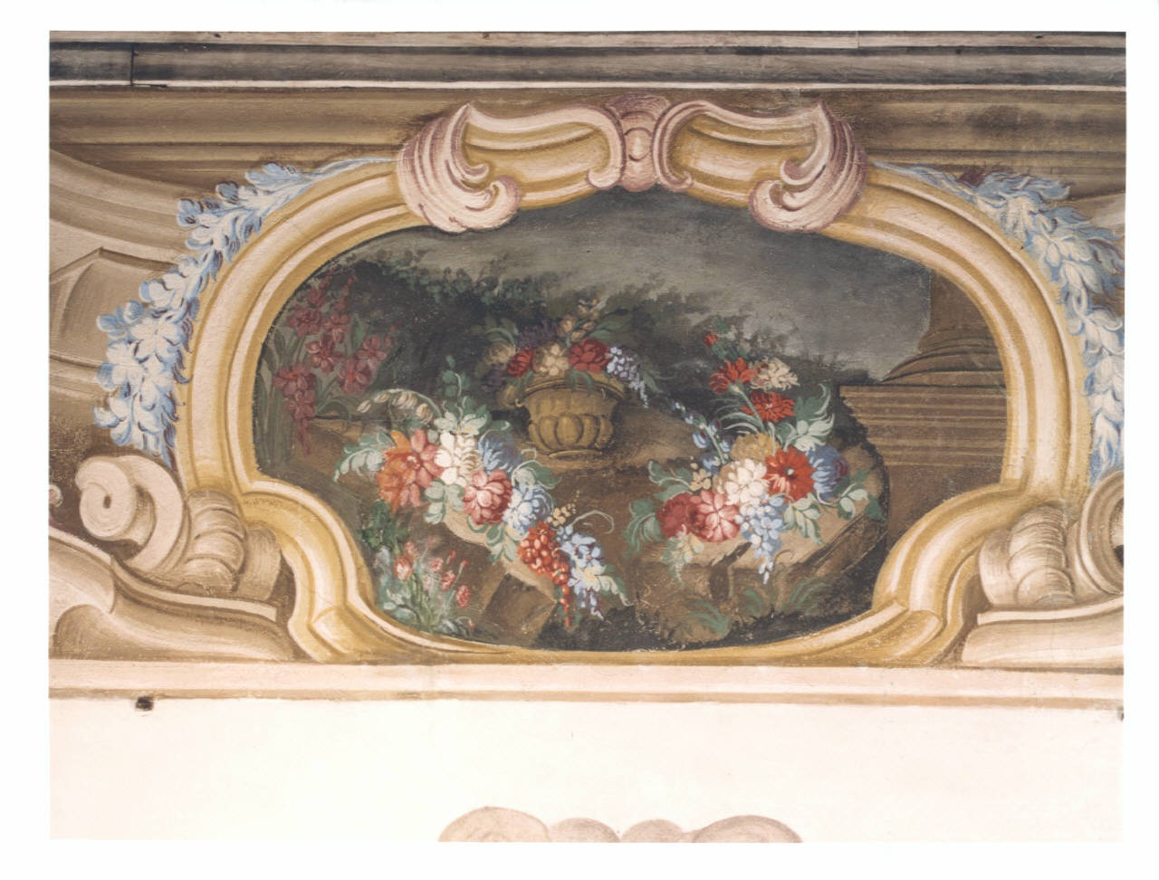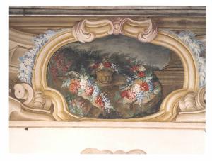 - NOTIZIE STORICO CRITICHE La stanza si caratterizza per una cornice continua composta da quadrature i cui angoli sono sottolineati da vasi di fiori. Al centro di ogni lato si aprono delle specchiature con ambientazioni rovinistiche arricchite da fiori disposti in vasi o a mazzi. La cornice che inquadra la stessa è sottolineata da foglie, a monocromo azzurro, che ne seguono il profilo sinuoso. Si ritiene che l'autore di questa decorazione possa essere un certo Romagnoli, di cui non si conoscono notizie ma che ha lasciato la propria firma nel salone del piano nobile, per lo stile minuzioso e un po' freddo.
