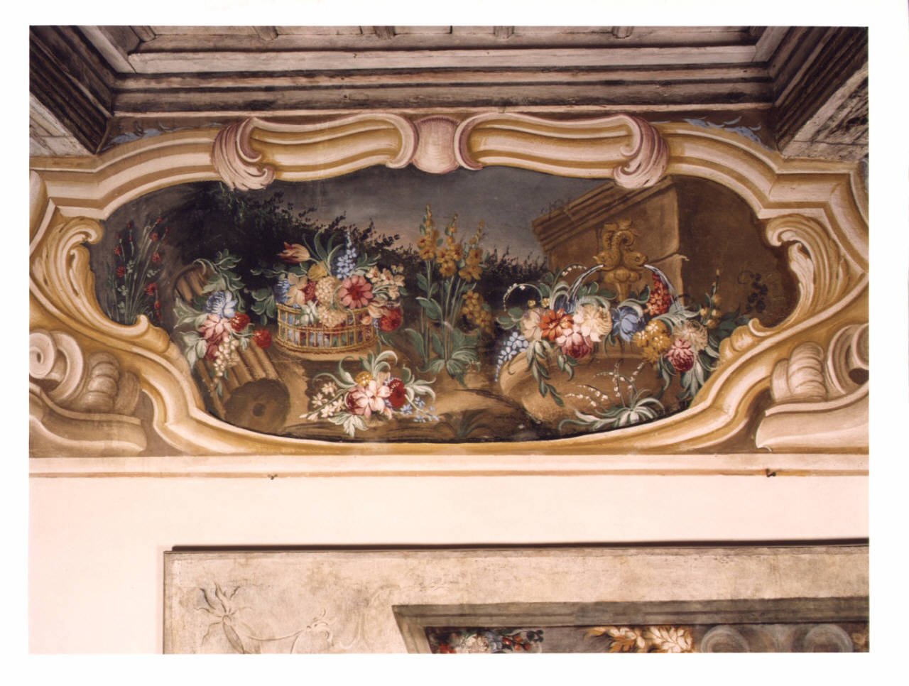 - NOTIZIE STORICO CRITICHE La stanza si caratterizza per una cornice continua composta da quadrature i cui angoli sono sottolineati da vasi di fiori. Al centro di ogni lato si aprono delle specchiature con ambientazioni rovinistiche arricchite da fiori disposti in vasi o a mazzi. La cornice che inquadra la stessa è sottolineata da foglie, a monocromo azzurro, che ne seguono il profilo sinuoso. Si ritiene che l'autore di questa decorazione possa essere un certo Romagnoli, di cui non si conoscono notizie ma che ha lasciato la propria firma nel salone del piano nobile, per lo stile minuzioso e un po' freddo.