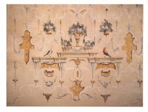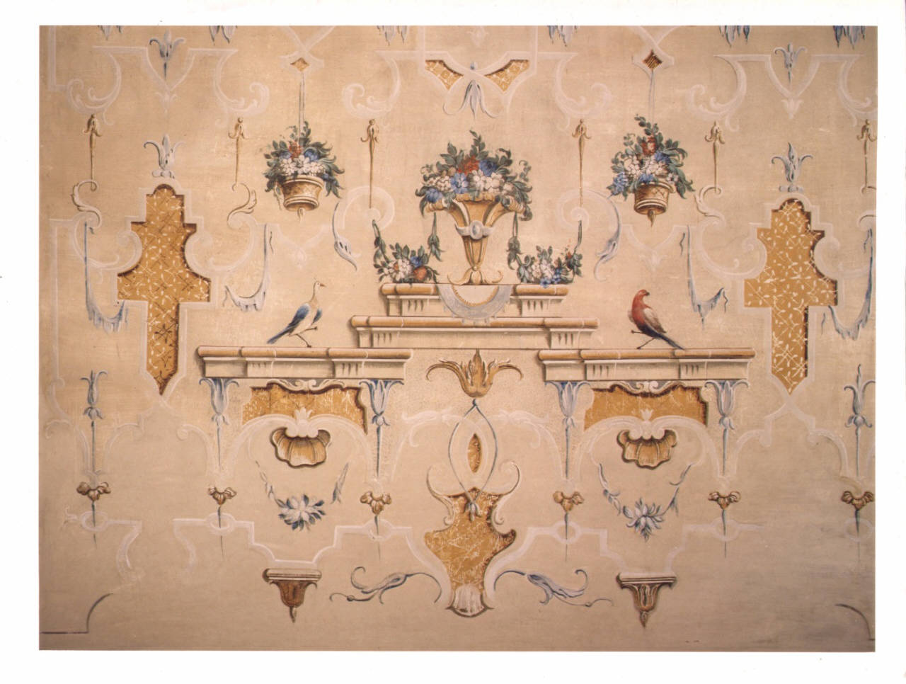- NOTIZIE STORICO CRITICHE Le pareti dell'alcova si caratterizzano per una decorazione a grottesca formata da piccoli elementi geometrici, vasi contenenti mazzi di fiori policromi, uccelli dal piumaggio colorato disposti lateralmente, su due mensole, al motivo centrale. Questa tipologia sembra richiamarsi al linguaggio di Filippo Minei, autore della riprese della grottesca rinascimentale e romana in ambito sabaudo, contaminata con le cineserie lette in chiave rococò. Per la datazione si propende, quindi, tra il quarto e quinto dcennio del Settecento, proponendo, per la committenza, l'alternanza fra gli ultimi anni di Giovan Angelo II Della Porta e i primi suoi successori.