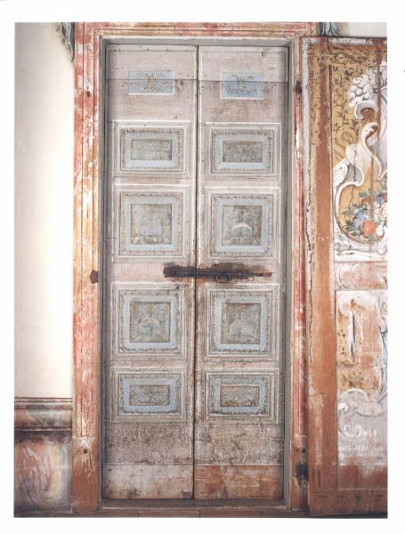 - NOTIZIE STORICO CRITICHE La porta ad anta unica ne racchiude una seconda a due battenti, in origine dipinta a tempera azzurra. Divisa in riquadri di diversa dimensione, presenta i caratteristici motivi decorativi a sottili cornici.