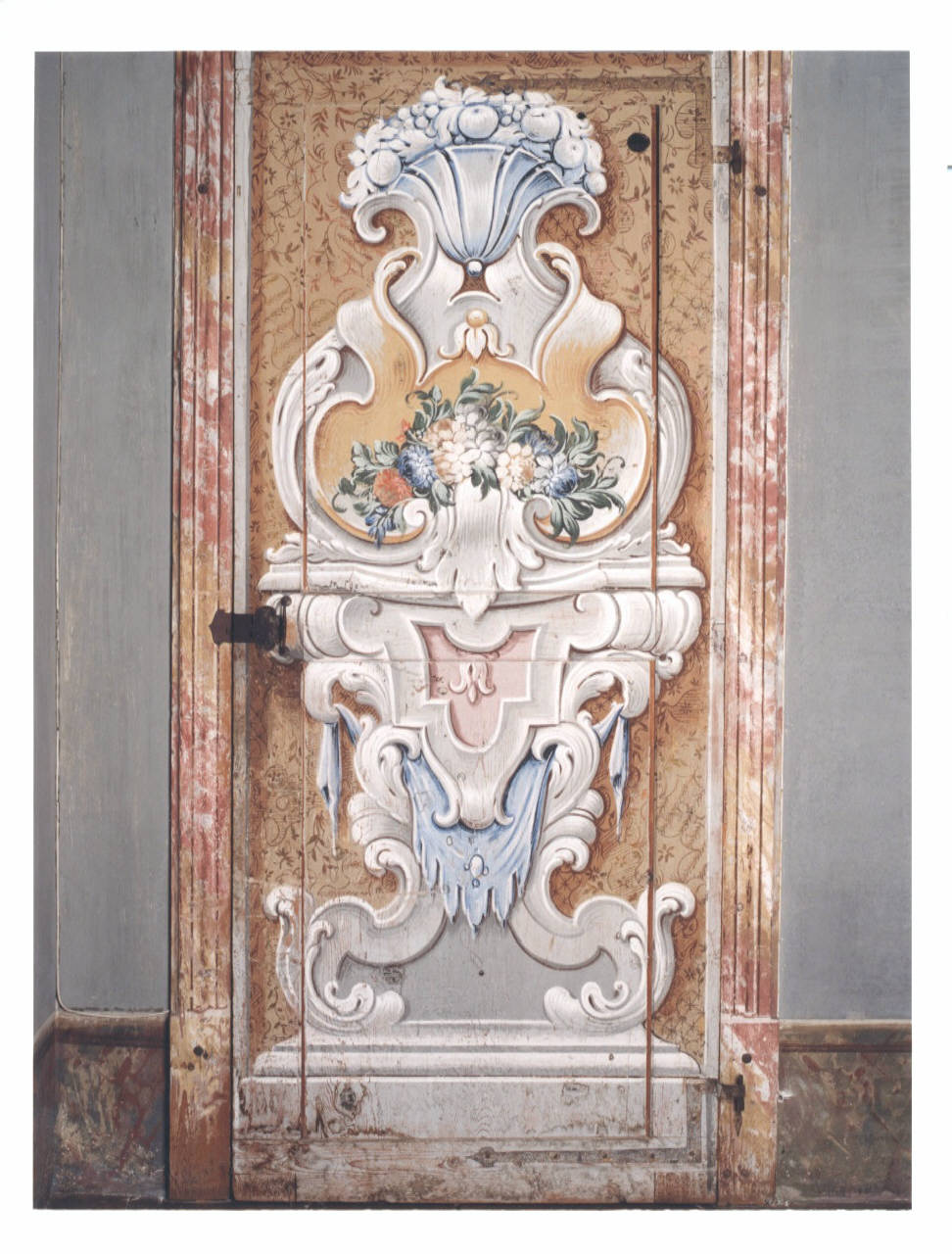 - NOTIZIE STORICO CRITICHE La porta è decorata sia sul recto che sul verso. Nella parte del recto compare, su un fondo giallo variegato da una sottile decorazionea racemi, pallini e reticoli nei toni del marrone, il consueto elemento architettonico costituito da un basamento con volute, in questo caso piuttosto accentuate quelle poste subito sopra lo zoccolo, e dai classici mazzi di fiori policromi che alleggeriscono la struttura. In alto coronamento con un vaso contenente dei frutti a monocromo. Il verso, mostra la stessa tipologia, perfino nel trattamento dello sfondo. Si ritiene possa essere attribuita alla equipe del Romagnoli, attivo nella decorazione di altre sale.