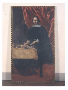 - NOTIZIE STORICO CRITICHE Il dipinto raffigura Antonio Maggi a figura intera, rivolto verso lo spettatore. Indossa un rigoroso abito di raso nero con cintura in vita, camicia bianca con polsi rivoltati e un ampio colletto a punta. Alle spalle un mantello nero con bordura in pizzo. Sul retro un ampio tendaggio rosso svela un fondale architettonico; a sinistra un tavolino ricoperto di stoffa chiara su cui trovano posto dei calami e una lettera. L'opera è riferibile al poco noto pittore milanese Giovan Battista Costa, autore di quattri analoghi ritratti della famiglia Lucini conservati presso la Pinacoteca del Castello Sforzesco di Milano, donati nel 1929 da Carolina Buschini, erede dei beni della nobildonna Matilde Lucini. L'identità di mano fra le tele del Castello e la tela in esame, come evidenziato da Silvia A. Colombo (Colombo S., 1999, con bibliografia precedente), emerge sia per gli aspetti stilistici sia per le identiche dimensioni, il che porterebbe ad ipotizzare l'appartenenza a una stessa serie smembrata per cause ereditarie. La sigla "G.B.C", posta in basso a sinistra, confermerebbe l'ipotesi attributiva.