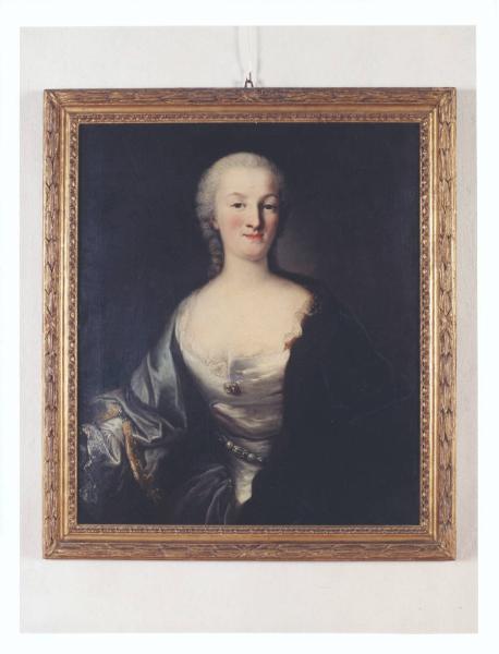 - NOTIZIE STORICO CRITICHE Il quadro mostra una figura femminile dall'elegantissimo abito di raso di seta nei toni del blu e bianco, arricchito da pizzi, dorati sulla manica di seta. I gioielli, pochi, sono piuttosto preziosi, come mettono in luce sia le perle sia il diamante della spilla. La giovane donna è raffigurata di tre quarti, con leggero movimento rotatorio delle spalle e del volto, che conferisce al dipinto una certa dinamicità. Molto accurati i passaggi chiaroscurali che esaltano il pallido incarnato e la morbidezza del tessuto.