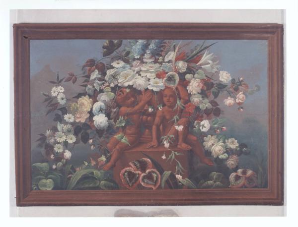 - NOTIZIE STORICO CRITICHE La tela si trova collocata nel bookshop di ingresso alla Villa, sulla parete sinistra. Probabilmente doveva costituire un paracamino, usato durante i mesi estivi, come la bella natura morta di fiori evidenzierebbe. Piacevole l'uso di un colore che richiami il bronzo per l'impostazione dei due putti e del vaso in cui è impostato il trionfo di fiori e foglie, che si ritrovano anche in primo piano.