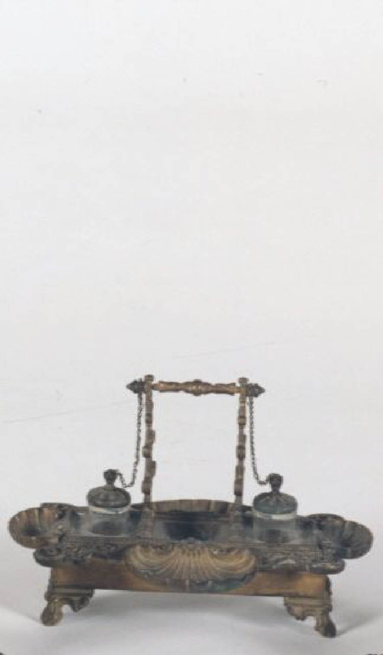Servizio da scrittoio in metallo dorato con base costituita da quattro conchiglie . Due piccoli porta inchiostro con coperchio agganciato mediante catenella.