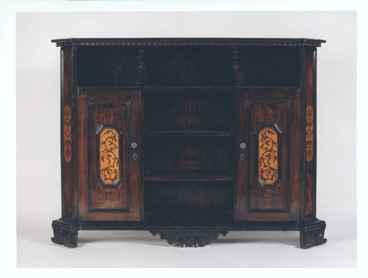 Credenza a due sportelli decorati laterali con pannelli intagliati entro cornici mistilinee con motivi a volute e floreali, al centro tre ripiani a vista, la parte superiore divisa in tre scomparti da sostegni a volute terminante con cornice modanata a dentello, piedi a mensola intagliati, pannelli laterali decorati con motivo intagliato che riprende quello presente sui due sportelli