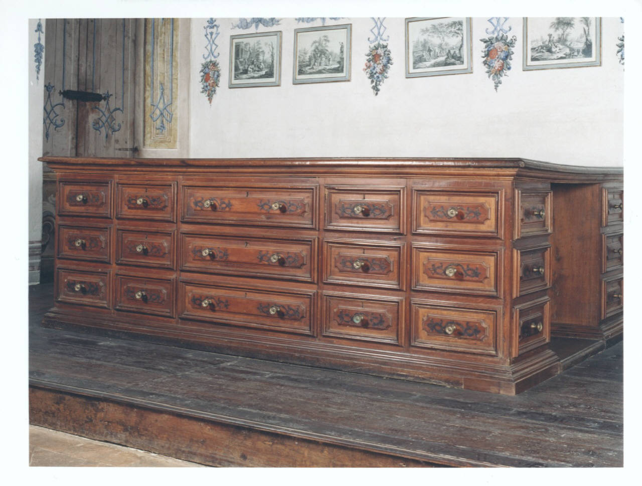 - NOTIZIE STORICO CRITICHE La scrivania fu realizzata nel 1733 appositamente per lo studio, insieme ai vestari e alla porta, dai fratelli Gattoni di Cabiaglio per volontà di \nGian Angelo III Della Porta, in occasione dei lavori di risistemazione della casa. Venne infatti innalzato "il suolo dell'originaria dispensa - canepa in modo da portarla a livello dell'antico studio ad esso attiguo, per meglio collegare la casa paterna con l'antica domus magna di cui lo studio faceva parte. Questi due locali furono così interamente risistemati con l\na realizzazione di un nuovo pavimento in quadrelli fatti dal mastro Francesco Pino, [...], con la fattura dei vestari e della scrivania dello studio da parte dei fratelli Gattoni di Cabiaglio [...]; in particolare uno dei vestari dello studio fu realizzato al posto di un antico camino, aperto poi nella stanza vicina." (Bassani e Cassani 1994). I cassetti sono decorati da sottili cornici dipinte in ocra e marrone, che danno l'illusione di una superficie incisa e riprendono la decorazione che si ritorva sugli armadi e sulla porta della stanza.