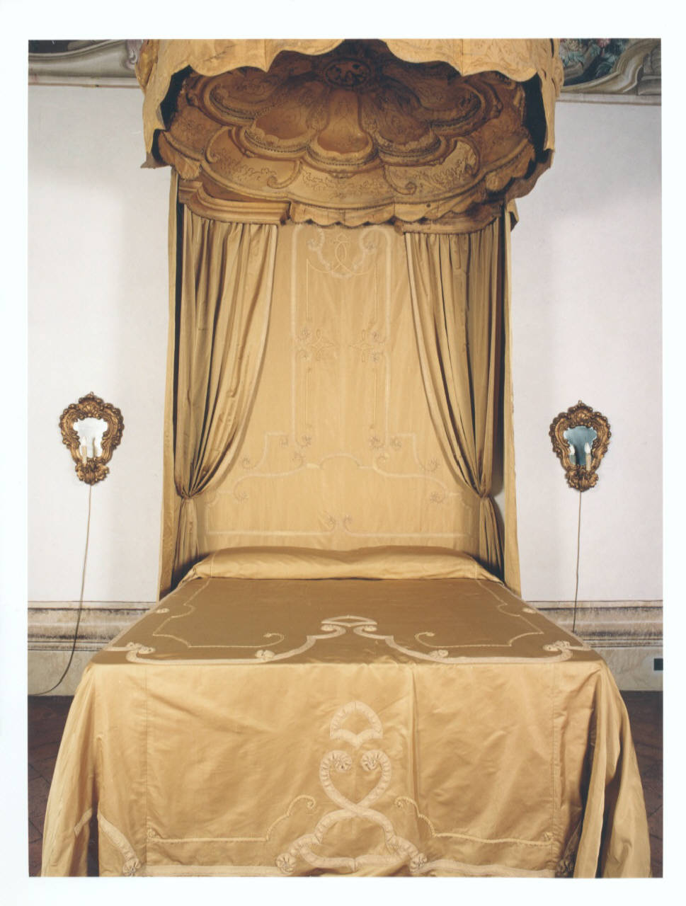 Letto con baldacchino circolare e sagomato fissato al muro senza l'ausilio di colonne, terminate con drappeggi e cortine; rivestito in seta damascata gialla, decorata ad appliquè con motivi in seta profilati da cordoncini in tinta