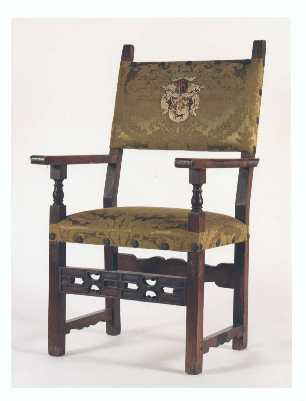 - NOTIZIE STORICO CRITICHE Seggiolone in stile tardo rinascimentale, modello rielaborato secondo i canoni dell'eclettismo storico della seconda metà dell'Ottocento. Originariamente era collocato nel Salone da ballo, come è documentato in alcune foto storiche di inizio secolo. Per il rivestimento è stata utilizzata una stoffa rinvenuta della villa che reca lo stemma della famiglia Bozzolo: uno scudo con all'interno un cane.