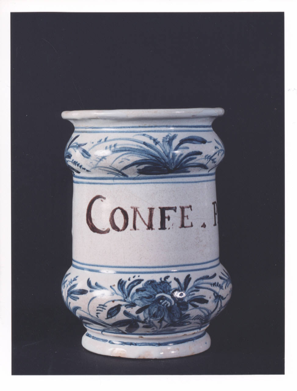 - NOTIZIE STORICO CRITICHE Vaso da farmacia proveniente dalla farmacia Barberis, attiva in Bistagno (Alessandria) dalla prima metà del XIX secolo. L'iscrizione testimonia l'originario contenuto dell'albarello: una confettura (medicamento di consistenza molle). In assenza del marchio della manifattura di produzione non si riesce a determinare se l'oggetto proviene da Savona o Albisola. La produzione dei due centri liguri ebbe infatti inizio con caratteri distinti e separati, ma finì per fondersi in uno stile e in una tecnica pressochè uguali.