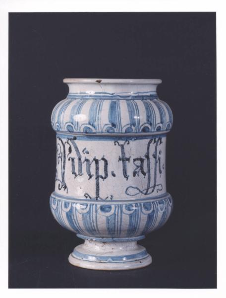 - NOTIZIE STORICO CRITICHE Vaso da farmacia proveniente dalla farmacia Barberis, attiva in Bistagno (Alessandria) dalla prima metà del XIX secolo. La tipologia decorativa comunemente chiamata a bacellature, che imita con pennellate di colore la forma degli argenti sbalzati dell'epoca, si diffonde, nella prima metà del XVIII secolo, in diverse manifatture italiane, in particolare nella zona veneta. La fortuna di questo tipo di decorazione si deve, in parte, anche a ragioni economiche data la semplicità esecutiva, inferiore come costo alla realizzazione di vasi con disegni più elaborati, come ad esempio quelli decorati a scenografia barocca. In assenza del marchio della manifattura di produzione non si riesce a determinare se l'oggetto proviene da Savona o Albisola. La produzione dei due centri liguri ebbe infatti inizio con caratteri distinti e separati, ma finì per fondersi in uno stile e in una tecnica pressochè uguali.