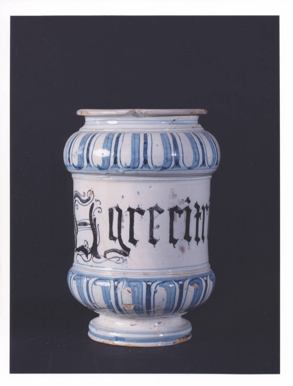 - NOTIZIE STORICO CRITICHE Vaso da farmacia proveniente dalla farmacia Barberis, attiva in Bistagno (Alessandria) dalla prima metà del XIX secolo. La tipologia decorativa comunemente chiamata a bacellature, che imita con pennellate di colore la forma degli argenti sbalzati dell'epoca, si diffonde, nella prima metà del XVIII secolo, in diverse manifatture italiane, in particolare nella zona veneta. La fortuna di questo tipo di decorazione si deve, in parte, anche a ragioni economiche data la semplicità esecutiva, inferiore come costo alla realizzazione di vasi con disegni più elaborati, come ad esempio quelli decorati a scenografia barocca. In assenza del marchio della manifattura di produzione non si riesce a determinare se l'oggetto proviene da Savona o Albisola. La produzione dei due centri liguri ebbe infatti inizio con caratteri distinti e separati, ma finì per fondersi in uno stile e in una tecnica pressochè uguali.