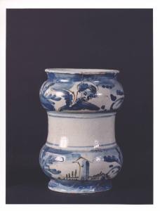 - NOTIZIE STORICO CRITICHE Vaso da farmacia proveniente dalla farmacia Barberis, attiva in Bistagno (Alessandria) dalla prima metà del XIX secolo. Sotto la base dell'alberello è dipinto in monocromia turchina su fondo bianco uno scudo crociato, marchio della famiglia Croce operante in Savona nei secoli XVII e XVIII; uno dei più noti ceramisti fu Giovanni Battista Croce. La tipologia decorativa comunemente chiamata a "scenografia barocca" si diffonde a partire dalla metà del XVII secolo, periodo in cui sui vasi di manifattura ligure si cominciano a riprodurre non solo elementi vegetali e animali, ma anche figure (putti, personaggi storici, mitoligici, biblici...) incornciate entro sfondi paesaggistici con cieli solcati da nuvole in cui compaiono anche elementi architettonici (ville, castelli...).