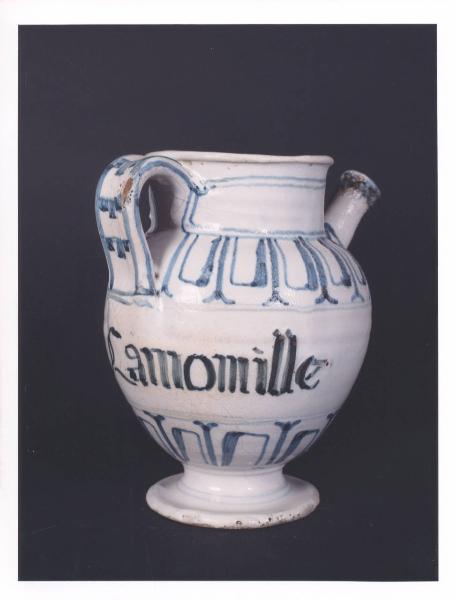 - NOTIZIE STORICO CRITICHE Vaso da farmacia proveniente dalla farmacia Barberis, attiva in Bistagno (Alessandria) dalla prima metà del XIX secolo. L'iscrizione testimonia l'originario contenuto del boccale: uno sciroppo alla camomilla. La tipologia decorativa comunemente chiamata a bacellature, che imita con pennellate di colore la forma degli argenti sbalzati dell'epoca, si diffonde, nella prima metà del XVIII secolo, in diverse manifatture italiane, in particolare nella zona veneta. La foruna di questo tipo di decorazione si deve, in parte, anche a ragioni economiche data la semplicità esecutiva, inferiore come costo alla realizzazione di vasi con disegni più elaborati, come ad esempio quelli decorati a scenografia barocca. In assenza del marchio della manifattura di produzione non si riesce a determinare se l'oggetto proviene da Savona o Albisola. La produzione dei due centri liguri ebbe infatti inizio con caratteri distinti e separati, ma finì per fondersi in uno stile e in una tecnica pressochè uguali.