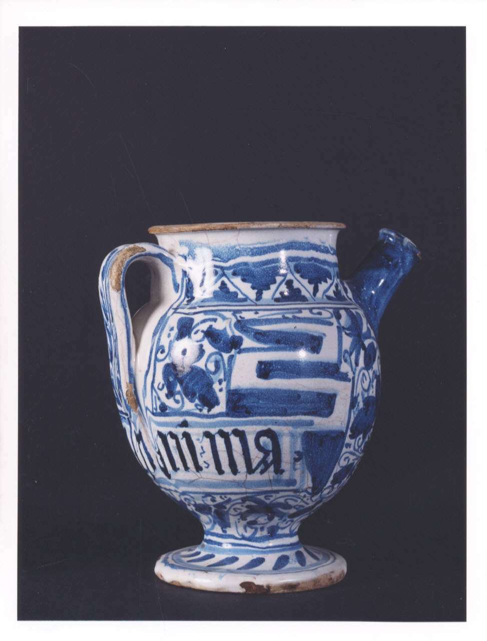 - NOTIZIE STORICO CRITICHE Vaso da farmacia proveniente dalla farmacia Barberis, attiva in Bistagno (Alessandria) dalla prima metà del XIX secolo. L'iscrizione è di difficile decifrazione. Tipologia decorativa comunemente chiamata "a foglia di prezzemolo". In assenza del marchio della manifattura di produzione non si riesce a determinare se l'oggetto proviene da Savona o Albisola. La produzione dei due centri liguri ebbe infatti inizio con caratteri distinti e separati, ma finì per fondersi in uno stile e in una tecnica pressochè uguali.