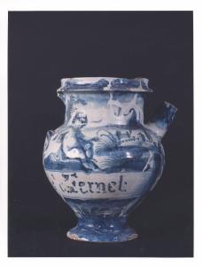- NOTIZIE STORICO CRITICHE Vaso da farmacia proveniente dalla farmacia Barberis, attiva in Bistagno (Alessandria) dalla prima metà del XIX secolo. Lo stato di conservazione del boccale rende in parte illeggibile l'iscrizione. La tipologia decorativa a "scenografia barocca" si diffonde a partire dalla metà del XVII secolo, periodo in cui sui vasi di manifattura ligure si cominciano a riprodurre non solo elementi vegetali e animali, ma anche figure (putti, personaggi storici, mitoligici, biblici...) incorniciate entro sfondi paesaggistici con cieli solcati da nuvole in cui compaiono anche elementi architettonici (ville, castelli...).