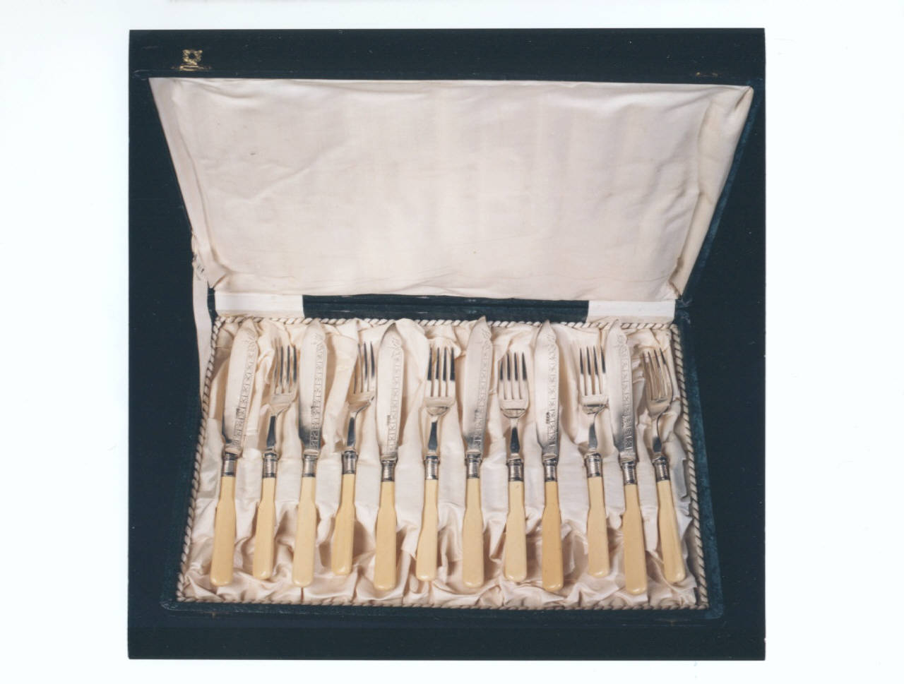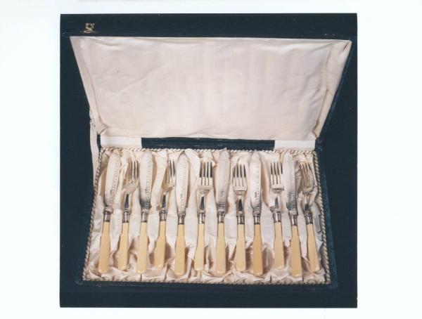 Servizio di posate da pesce da dodici con impugnatura in osso; la lama del coltello è decorata da una greca verticale lungo la parte destra