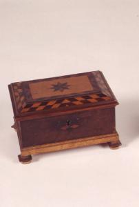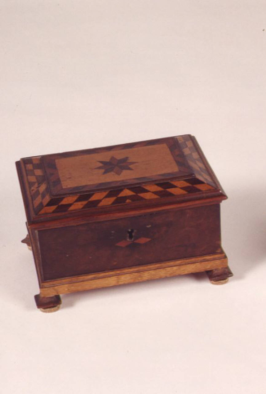 Piccola scatola a forma di parallalepipedo, coperchio decorato a motivi a scacchiera e centrato da una stella a otto punte; poggiante su quattro piedini a mensola