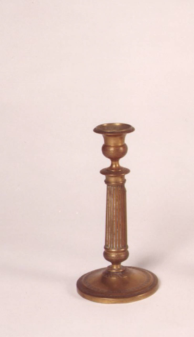 Fusto a colonna leggermente rastremata verso l'alto con scalanature verticali, base circolare con decorazioni a foglioline e a raggiera obliqua, reggicero a vaso decorato a motivi floreali con bocca profilata a cordoncino