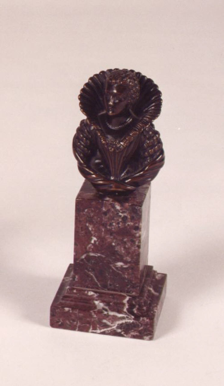 Busto raffigurante una dama elegantemente vestita su sostegno a parallalepipedo con base gradinata