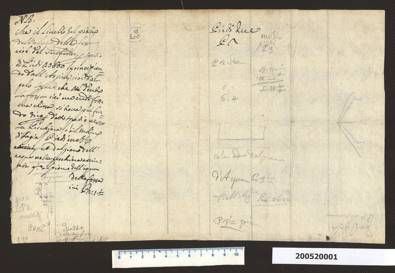 - NOTIZIE STORICO CRITICHE Nella "Spiegazione de numeri" del tomo nel quale era rilegato il disegno viene definito dopo i due disegni di cui al numero inv.2,5 e 2,5 bis: "(...) Foglio, con una N.a sopra alcune misure".\nQuesto foglio, allegato ai due piccoli disegni sopra citati secondo l'antico elenco, indica alcuni livelli del terreno e distanze dall'argine della fossa. Sono presenti degli schizzi con misure di rilievo e uno schizzo forse relativo al tetto, lungo il margine destro del foglio. L'attribuzione a Domenico Martinelli è derivata da un confronto della grafia con quella di documenti da lui sicuramente redatti.