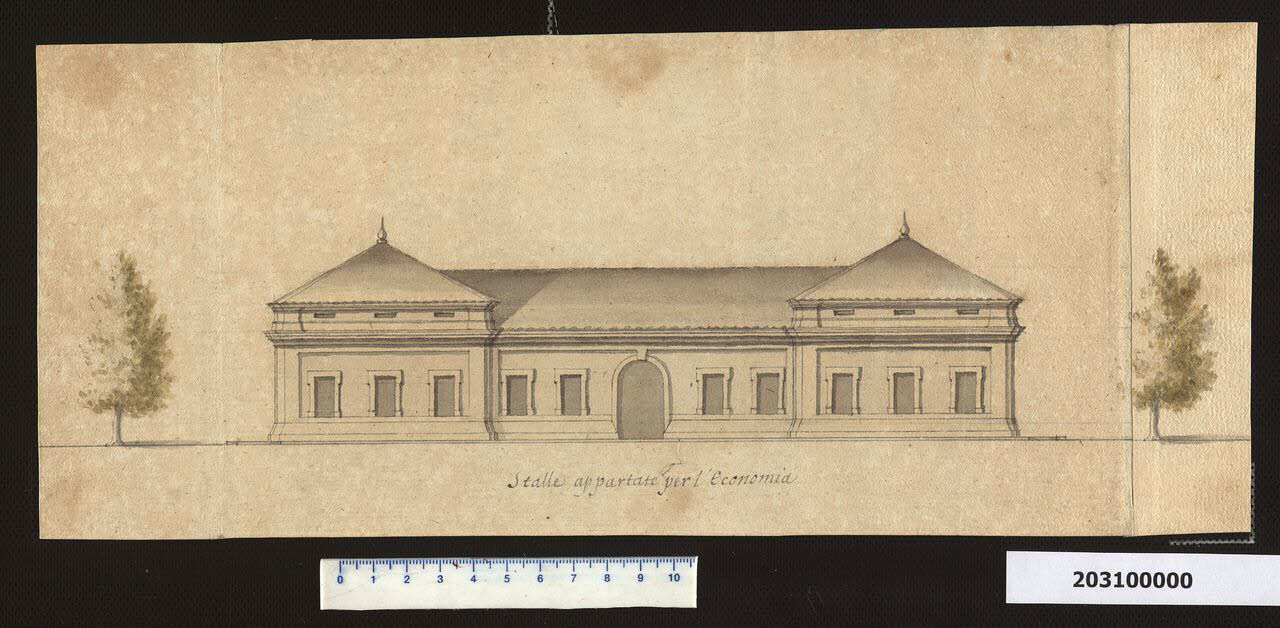 - NOTIZIE STORICO CRITICHE Nella "Spiegazione de numeri" del tomo nel quale era rilegato il disegno viene definito: "Facciata delle Stalle per l'economia". A partire dal 1692, Dominik Andreas Kaunitz aveva incamerato vaste proprietà terriere nella piana di Neutra-Tal, a nord di Neu-Häusl (Nové Zàmky) (Ungheria) che, nel 1694, dopo aver ottenuto l'autorizzazione imperiale, chiamò "Neu-Kaunitz". Mentre ad Austerlitz doveva sorgere la grande industria manifatturiera, qui era stata pianificata un'enorme scuderia, un allevamento di cavalli, della cui progettazione, Kaunitz, incaricò Domenico Martinelli, che in qualità di suo architetto, doveva occuparsi di tutte le costruzioni sparse nei territori moravi e ungheresi. Il progetto di Neu-Kaunitz data probabilmente a dopo il 1700, anche se i documenti registrano la presenza di muratori e scavatori già nel 1698-99, mentre quella del Martinelli è documentabile a partire dal 1701. La costruzione delle scuderie, che non verranno realizzate secondo questo progetto, rallenta nel 1703 e si interrompe definitivamente nel 1704. Il disegno è relativo al prospetto delle stalle per "l'economia" (così definite perché, probabilmente, sfruttate anche per l’agricoltura), allineate lungo il lato principale del complesso di Neu-Kaunitz, e per tale motivo, riprende il medesimo schema compositivo delle stalle previste ai lati della residenza del conte. Due corpi leggermente sporgenti, caratterizzati da lesene angolari su basamento continuo che funge anche da davanzale alle tre finestre, bloccano ai lati il corpo centrale con il portale di ingresso dotato di semplice profilatura e chiave di volta. Al di sopra di un architrave continua che unisce tutto il prospetto, si aprono le feritoie del sottotetto. Il disegno è identico a quello conservato a Milano, Collezione Sardini Martinelli inv. 2,33 (Lorenz 1991, MZ 360).