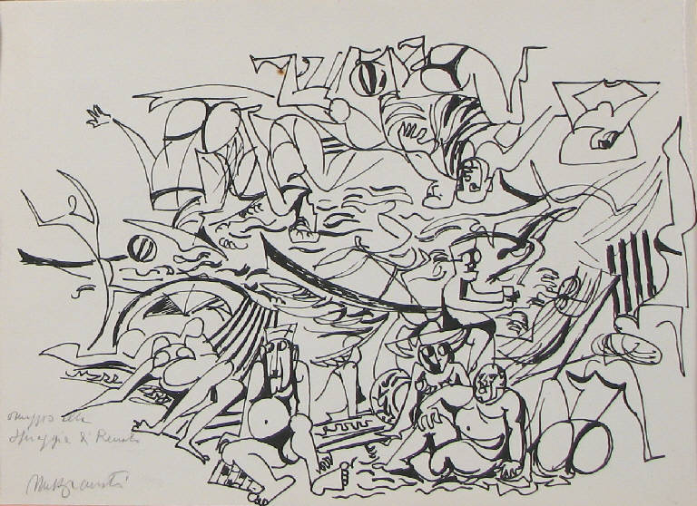 - NOTIZIE STORICO CRITICHE Come si deduce dal titolo segnato sul foglio, questo schizzo a china è un omaggio di Mazzacurati al noto dipinto dell'amico Renato Guttuso intitolato "La spiaggia" (1955-'56).\nIl disegno dunque è stato con ogni probabilità eseguito in un'epoca di poco successiva alla realizzazione de "La spiaggia" da parte di Guttuso. \nAnche Mazzacurati però esegue, all'incirca nello stesso anno, un lavoro sul medesimo soggetto: un bassorilievo quasi identico al disegno della collezione Lajolo (De Luca/ Mazzarella, 1995). \nLa china potrebbe dunque essere stata nello stesso tempo omaggio al dipinto di Guttuso e studio preparatorio per la propria opera scultorea.\nI fenomeni di massa della nascente società dei consumi costituiscono un tema che interessa Mazzacurati: lo dimostrano il dipinto intitolato "Piper" (1964-'67) e i numerosi disegni con questo soggetto da lui eseguiti negli anni '60 che raffigurano i giovani che ballano nella famosa discoteca di Viareggio (Omaggio Mazzacurati, 1971), lavori che ricordano tra l'altro un altro dipinto di Guttuso realizzato nel decennio precedente, "Boogie woogie" (1953).\nGià da prima della guerra Mazzacurati si era fatto conoscere come attento osservatore del costume italico, sia, a livello verbale, attraverso l'invenzione di motti satirici poi divenuti celebri, sia, nel campo artistico, attraverso la realizzazione di opere scultoree che ritraevano in forma caricaturale la società fascista ed i suoi protagonisti (la serie degli "Imperatori", del 1942-'43; quella delle "Gerarchie", del 1943-'44).\nLa tipologia dei suoi "Imperatori", che stigmatizzava quella dello stesso duce, si ritrova, nonostante gli anni di storia trascorsi, anche in questo disegno della collezione Lajolo, seduta sulla spiaggia in primo piano accanto ad un personaggio femminile, perfettamente inserita tra le figure che popolano l'Italia postbellica.\nQuanto allo stile del disegno, esso è molto lontano da quello dell'amico Guttuso al quale fa esplicito riferimento: sia la raffigurazione dei personaggi che la costruzione dello spazio sono di tipo astratto-geometrizzante, una delle modalità esecutive cui Mazzacurati, nel suo eclettismo, ricorre.